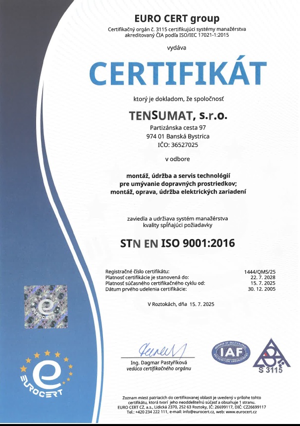 Spoločnosť TENSUMAT, s.r.o. je držiteľom certifikátov Integrovaného systému manažérskeho riadenia kvality podľa STN EN ISO 14 001 a STN EN ISO 9001.